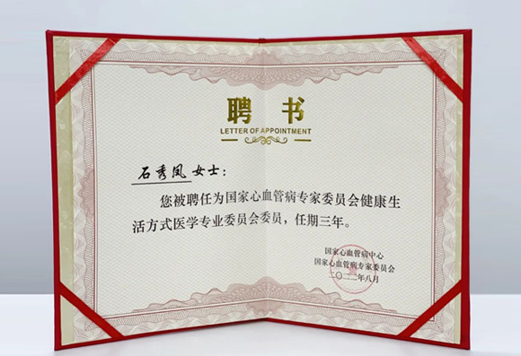 喜讯!祝贺石秀凤女士被聘为国家心血管病专家委员会健康生活方式医学专业委员
